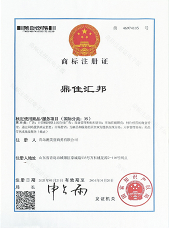 “鼎佳汇邦”35类商标注册证